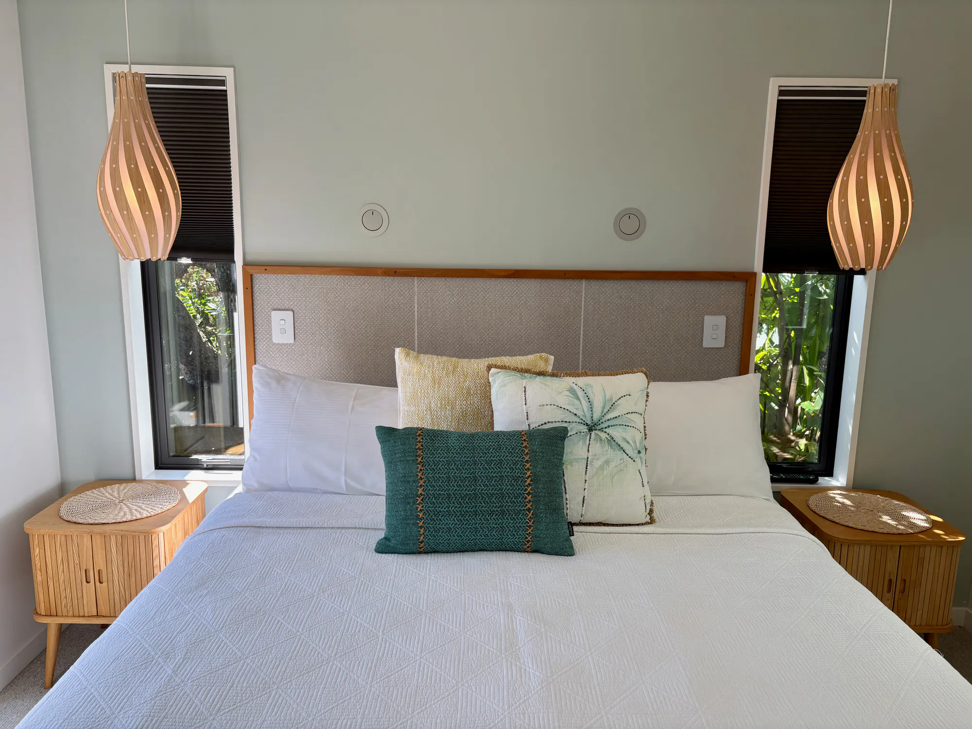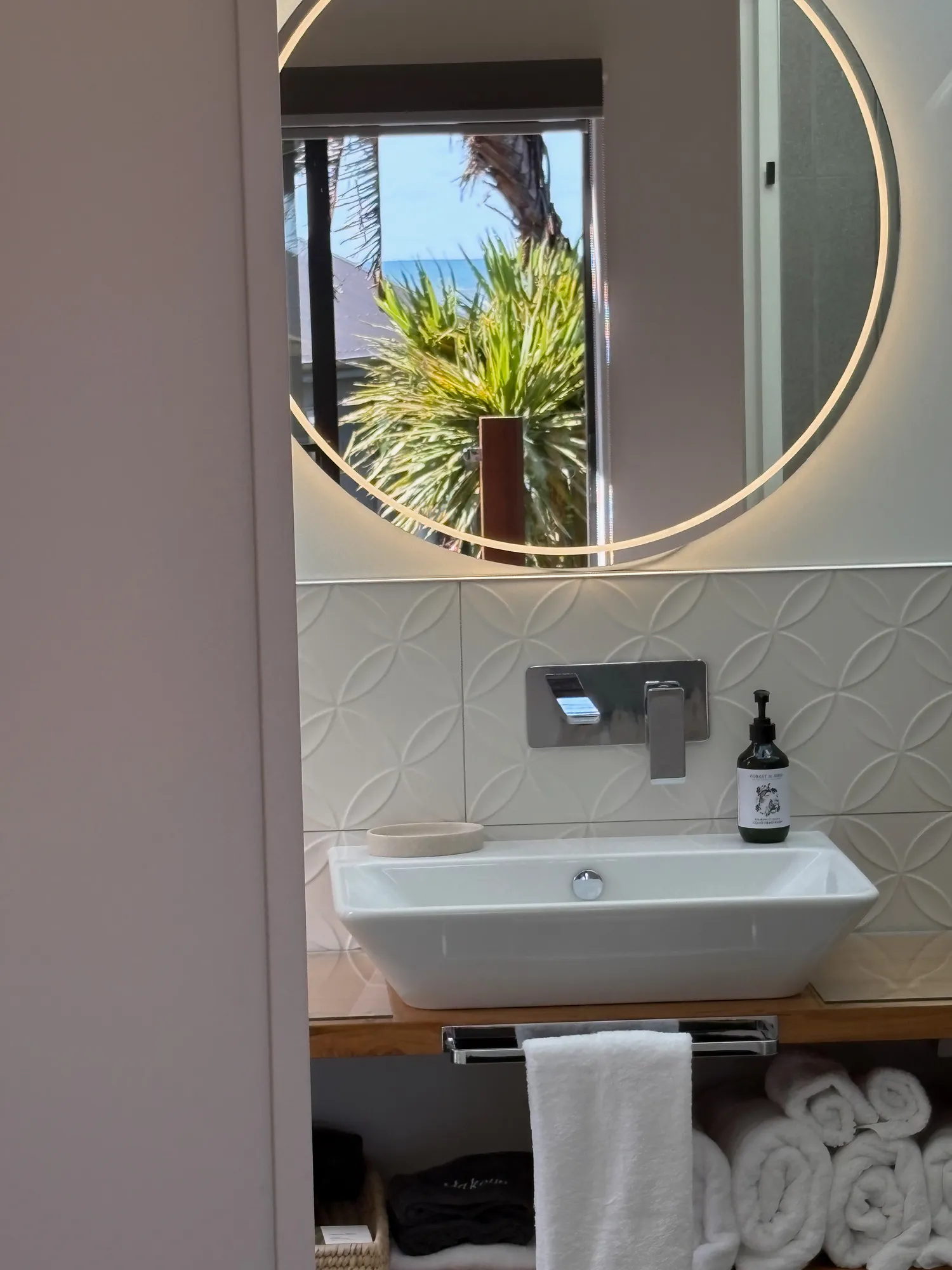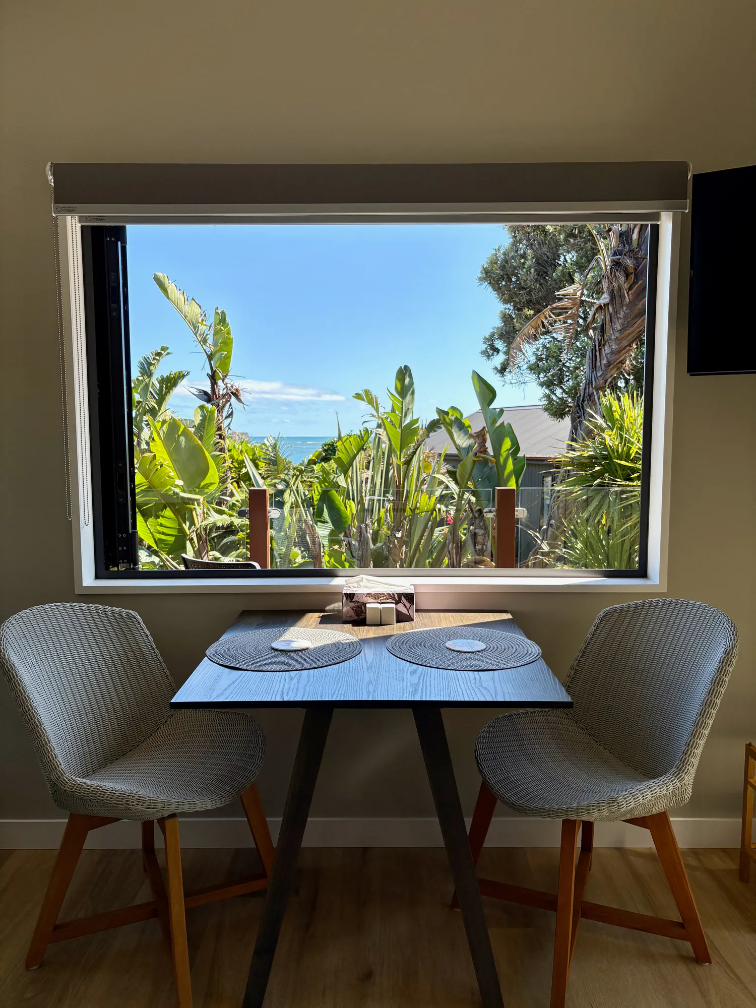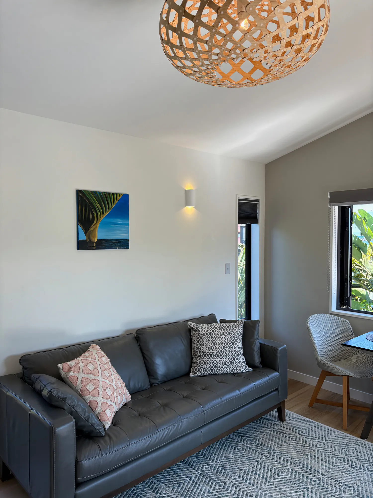 Inside, the décor reflects a refined coastal aesthetic. The space features 100% wool carpet, Italian natural stone tiles, and a bespoke bathroom vanity crafted from native timber, all combining to create a simple, elegant beachside atmosphere grounded in natural materials.