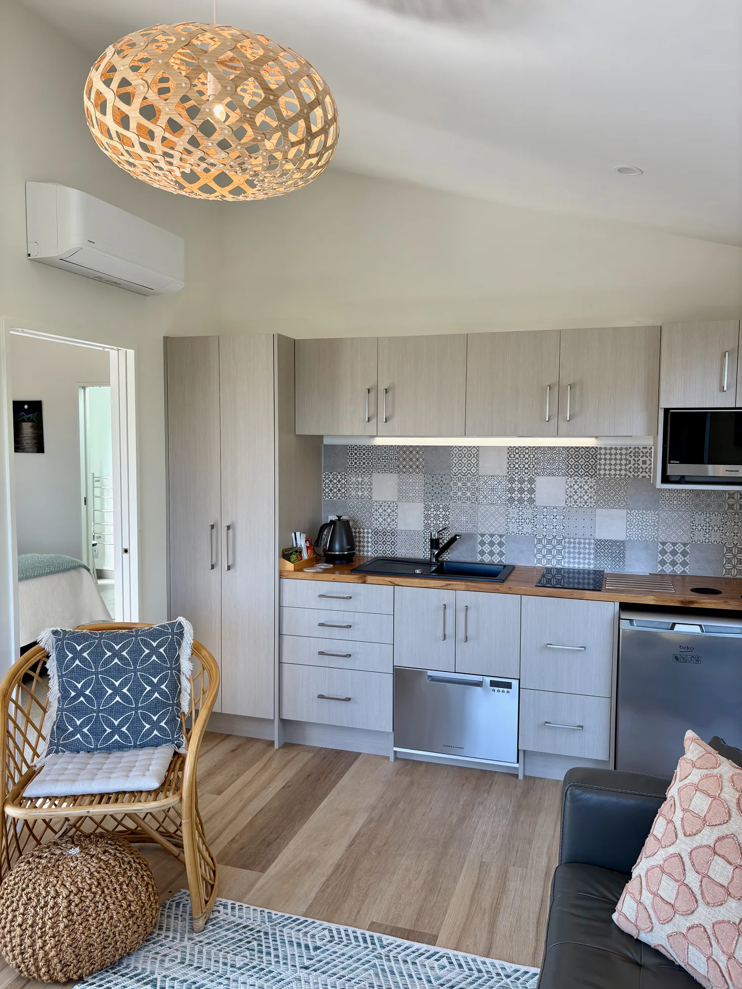 - a kitchenette with timber countertop, granite stone sink, tea/coffee facility, microwave & dishwasher