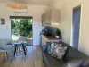 - Lounge/dining area with dining table, leather sofa, chaise lounge chair, foot stool, flat screen TV.