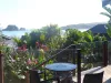 - French doors in the bedroom open from the bedroom onto a small private southwest-facing deck with glimpses of the Tasman Sea.